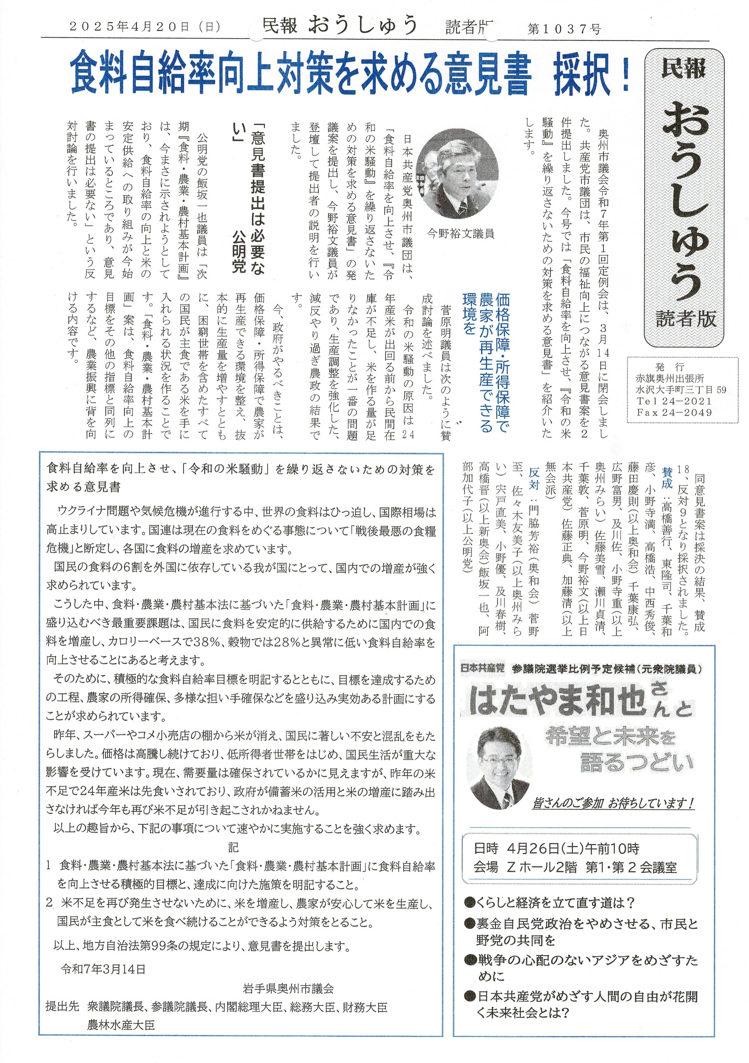 「民報おうしゅう第1037号」はこちら