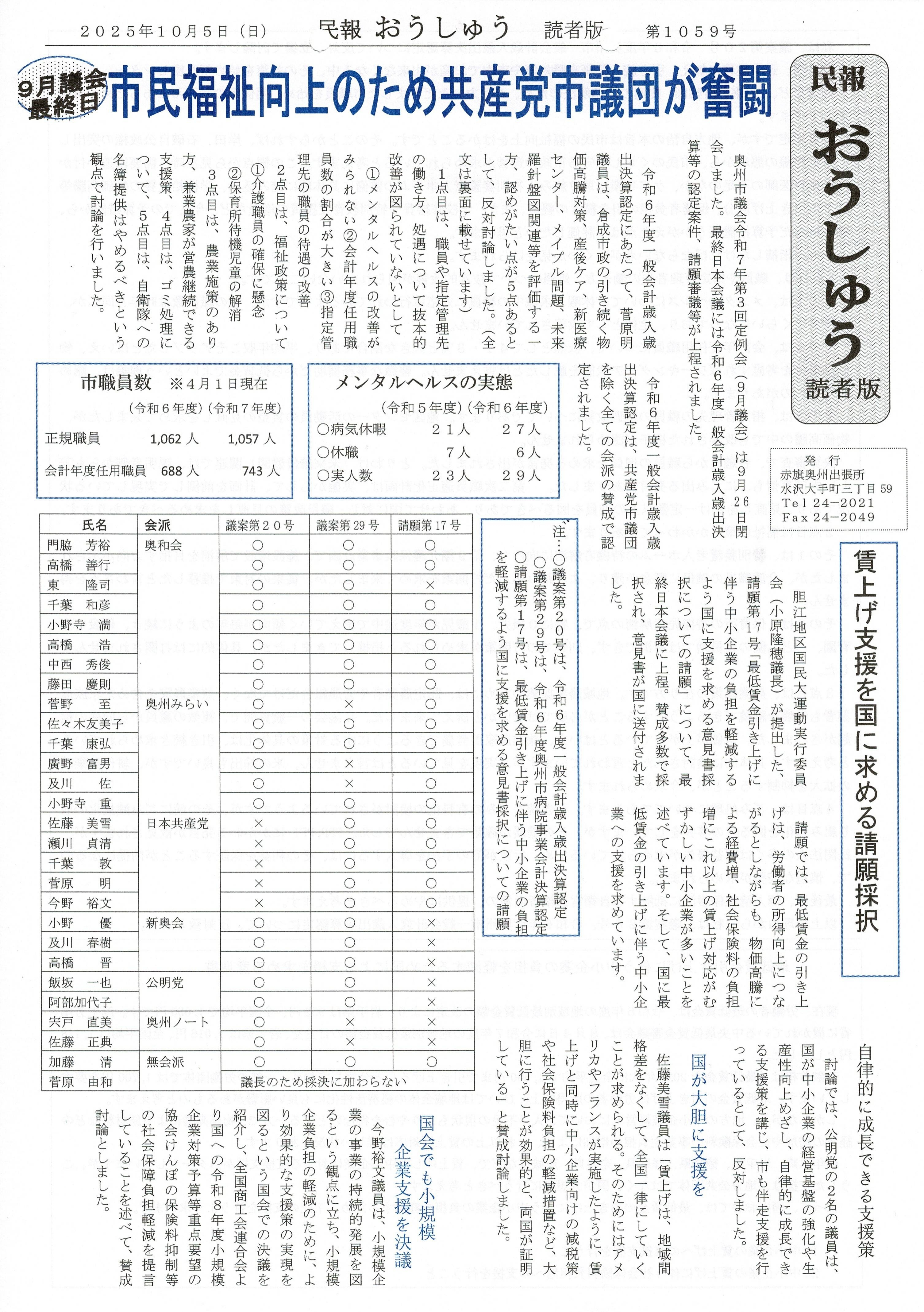 「民報おうしゅう第1059号」(表)はこちら